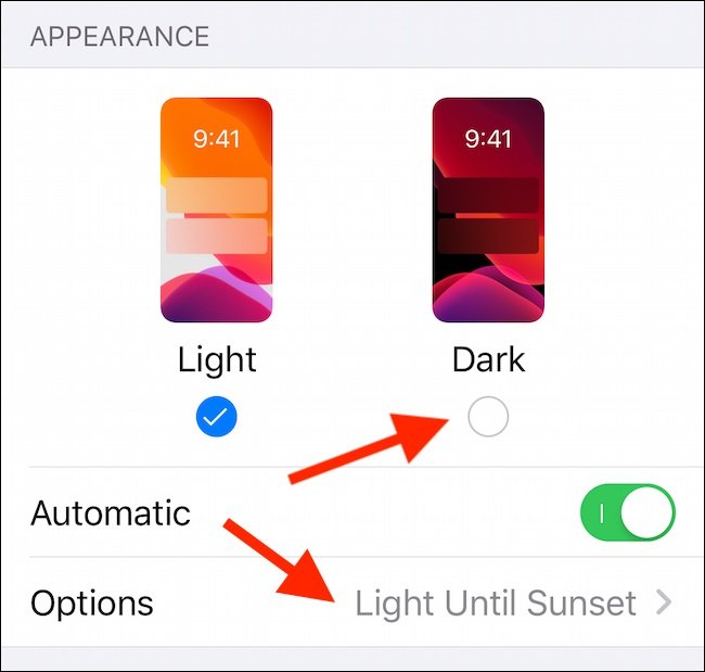 Aşağıda, bir Otomatik seçeneği bulacaksınız. Etkinleştirildiğinde, karanlık modu günbatımında veya özel bir zaman diliminde otomatik olarak açılacak şekilde ayarlayabilirsiniz. Zamanlamayı özelleştirmek için “Seçenekler” düğmesine dokunabilirsiniz.