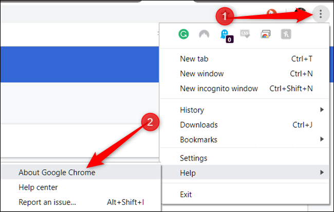 Chrome’da, menü (üç nokta)> Yardım> Google Chrome Hakkında’yı tıklayın. Ayrıca Chrome’un adres kutusuna chrome://settings/help yazıp Enter’a basabilirsiniz.