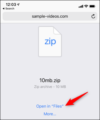 Safari‘de bir zip dosyası indirdiğinizde, iPhone veya iPad’iniz bunu Dosyalar uygulamasında açmayı önerecektir. Bunu yapmak için “Dosyalarda Aç” a basın. Ayrıca, zip dosyalarını diğer uygulamalardan Dosyalar uygulamasına da kaydedebilirsiniz.
