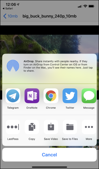 Zip arşivindeki bir dosyayı ayıklamak için Paylaş düğmesine dokunun ve dosya uygulamanıza kaydetmek için “Dosyalara Kaydet” i seçin veya hemen göndermek için uygulamaya dokunun.