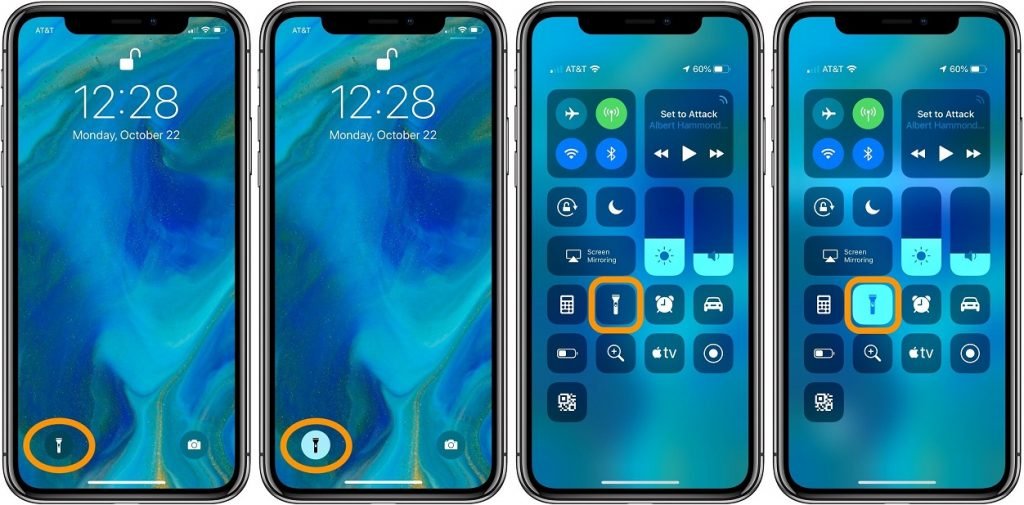 El fenerini kullanmanın bir diğer yaygın yolu Kontrol Merkezi’dir. iPhone 8/8 Plus ve üstü için ekranınızın altından yukarı doğru kaydırın ve el feneri simgesine dokunun.