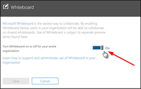 Şimdi, Whiteboard panelinde, Organizasyonunuzun tamamı için Whiteboard’u Açık veya Kapalı konumuna getirin.