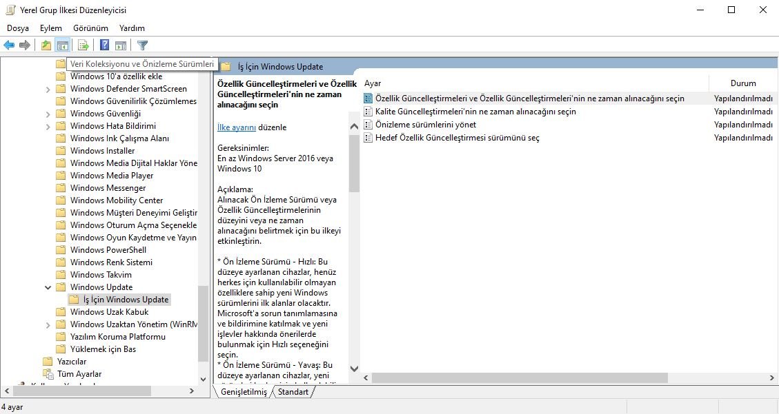Bilgisayar Yapılandırması > Yönetim Şablonları > Windows Bileşenler > Windows Update > İş İçin Windows Update - Select when Preview Builds and Feature Updates are received (Özellik Güncelleştirmeleri ve Özellik Güncelleştirmeleri’nin ne zaman alınacağını seçin) ilkesini çift tıklayın.