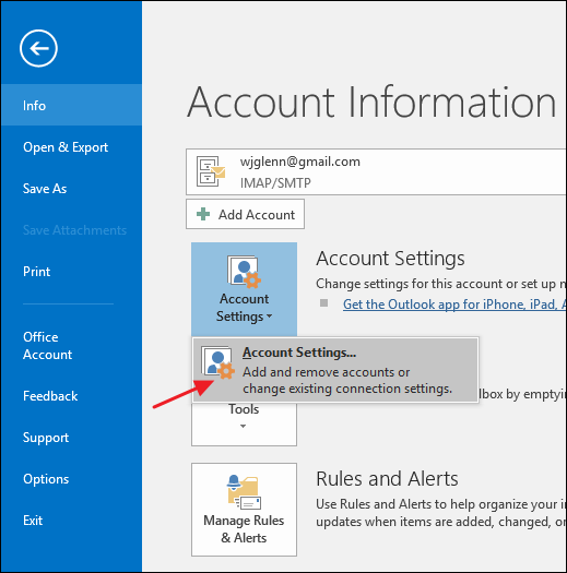 Outlook’ta bir e-posta hesabının PST dosyasının nerede depolandığını da öğrenebilirsiniz. Outlook 2010, 2013 ve 2016’da “Dosya” menüsünü tıklayın, “Hesap Ayarları” açılır menüsünü ve ardından “Hesap Ayarları” nı tıklayın. Outlook 2007’de “Hesap Ayarları” seçeneğini bulacaksınız.