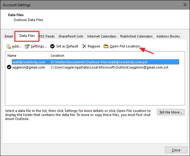 “Hesap Ayarları” penceresinde, “Veri Dosyaları” sekmesinde, bulmak istediğiniz hesabı seçin ve “Dosya Konumunu Aç” düğmesine tıklayın.
