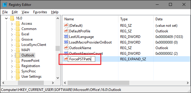 Ardından, bu Outlook anahtarının içinde yeni bir değer oluşturun. Outlook anahtarını sağ tıklayın ve Yeni> Genişletilebilir Dize Değeri’ni seçin. Yeni değeri ForcePSTPath olarak adlandırın. Bir PST dosyası yerine OST dosyasıyla çalışıyorsanız, bunun yerine ForceOSTPath adlı bir değer oluşturabilirsiniz. Aslında, her iki değeri de oluşturmak iyi bir fikir olabilir, böylece tüm Outlook veri dosyalarınızı tek bir konumda bir arada tutabilirsiniz.