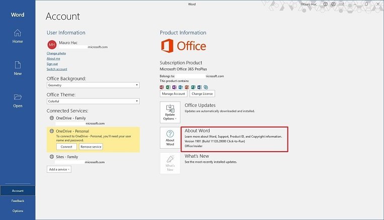 - Sağ tarafta, Word Hakkında’nın altındaki sürüm bilgilerini kontrol edin.