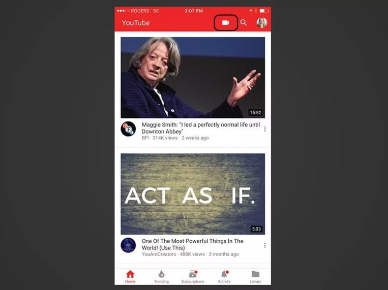 YouTube mobil uygulamasından upload yapacaksanız, ekranın sağ üst köşesinde görünen kamera simgesini bulun ve ona dokunun.