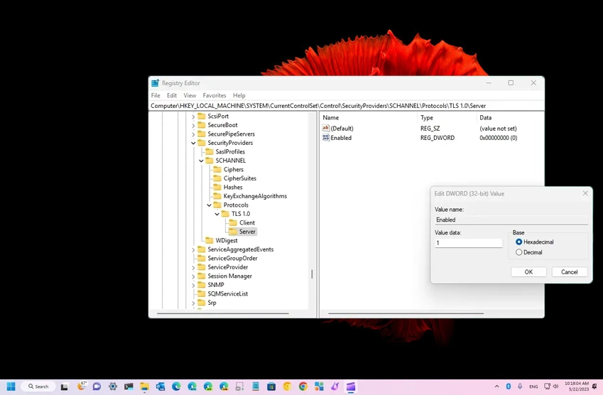 Ancak gerçekten ihtiyacınız varsa veya Windows Olay Günlüğünde “Evet 36871 “i fark ederseniz örneğin, “A fatal error occurred while creating a TLS <client/server> credential. The internal error state is 10013. The SSPI client process is <process ID>”, Windows 11’de TLS sürüm 1.0 ve 1.1’i etkinleştirmek mümkündür, ancak Kayıt Defterini değiştirmeniz gerekecektir.