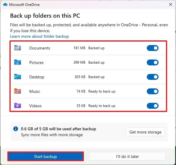 - “Belgeler”, “Resimler”, “Masaüstü”, “Müzik” ve “Videolar” dahil olmak üzere buluta yedeklemek istediğiniz klasörler için geçiş anahtarını açın.