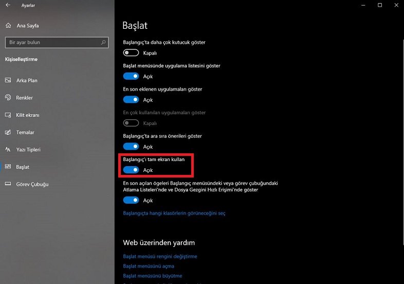 Windows 10 Başlat Menüsü Tam Ekran Etkinleştirme