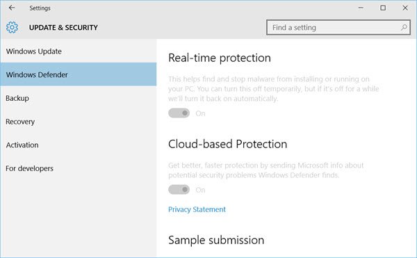 Windows 10 1607 ve sonraki sürümlerde, Windows Defender Güvenlik Merkezi> Virüs ve Tehdit Koruması> Virüs ve Tehdit Koruması ayarlarını açmanız ve Gerçek Zamanlı korumayı kapatmanız gerekmektedir.