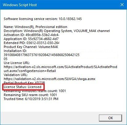 5- “Lisans Durumu” bölümünü kontrol edin ve Windows 10’un tamamen etkinleştirildiğini doğrulamak için durumda “Lisanslı” yazıdığından emin olun.