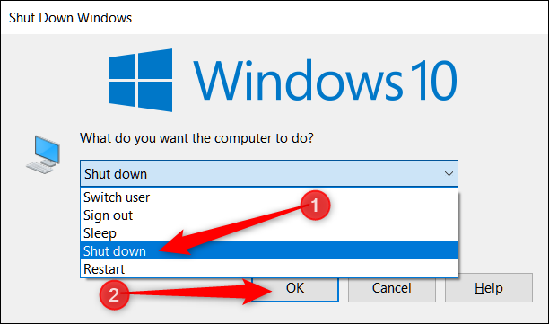 Ardından iletişim penceresini açmak için Alt + F4 tuşlarına basın. Açılır menüden “Kapat” ı seçin ve ardından “Tamam” ı tıklayın.