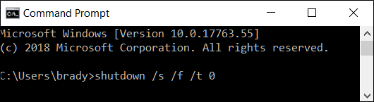 Bu komutta, /s kodu bir kapatma hatası verir, /f kodu çalışan uygulamaları uyarı vermeden kapanmaya zorlar ve /t kodu bir zaman aşımı süresi ayarlar (sondaki sıfır, bu zaman aşımını sıfır saniye olarak ayarlar).