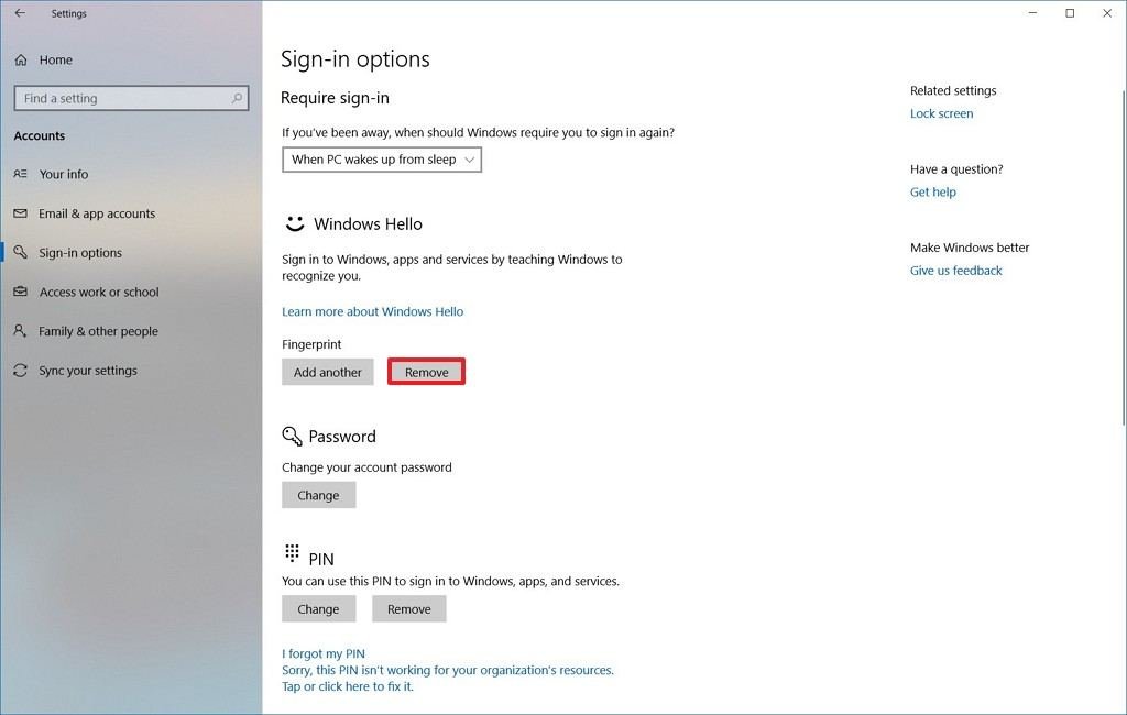 4- “Windows Hello” bölümünün altında, Kaldır düğmesine tıklayın.