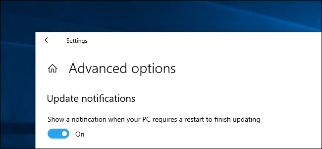 Bu görev çubuğu bildirim alanı simgesi test sistemimizde varsayılan olarak kapalıydı. Windows 10 1903’de etkinleştirmek için, Ayarlar> Güncelleştirme ve Güvenlik> Windows Update> Gelişmiş Seçenekler’e gidin ve “Güncellemeyi nedeniyle bilgisayarınızı yeniden başlatılması için bir bildirim göster” seçeneğini “Açık” olarak ayarlayın.