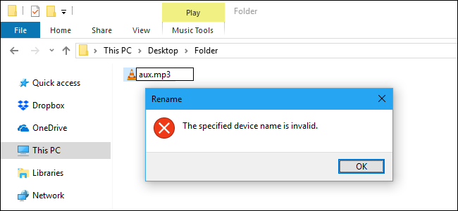 Windows belirli dosya adlarını “saklar” ve bunları hiçbir yerde kullanmanıza izin vermez. Bir dosyayı “con.txt” veya “aux.mp3” olarak isimlendirmeyi unutun.