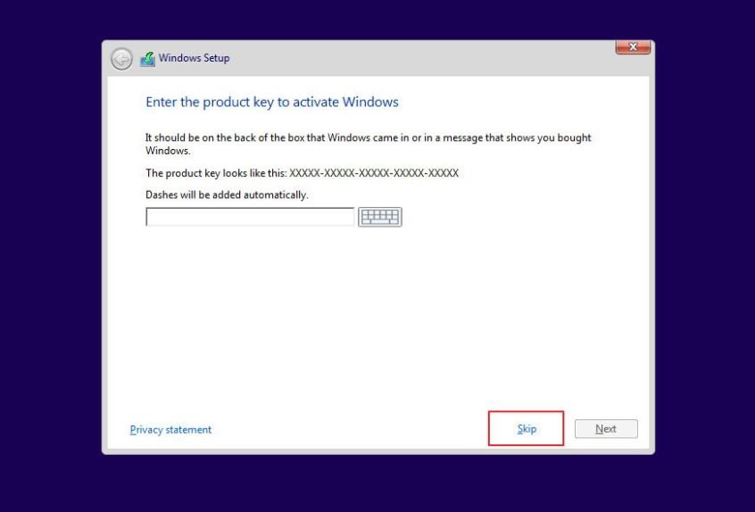 5- Windows 10’u yüklemek için ürün anahtarını girin veya yeniden yüklüyorsanız Atla düğmesini tıklayın. Kurulumdan sonra Windows 10 otomatik olarak aktif hale gelecektir.