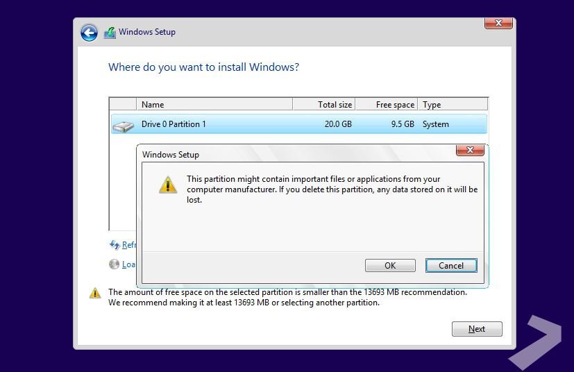 9- Windows 10’u yüklemek istediğiniz sabit diskteki bölümü seçin ve Sil düğmesine tıklayın. Genellikle “Drive 0”, tüm yükleme dosyalarını içeren sürücüdür.