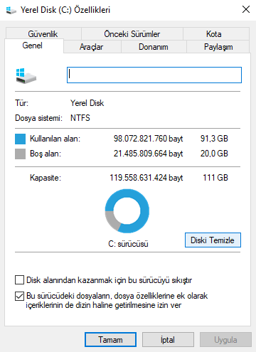 Disk Temizleme programını doğrudan C – Özellikler altından da erişebilirsiniz.