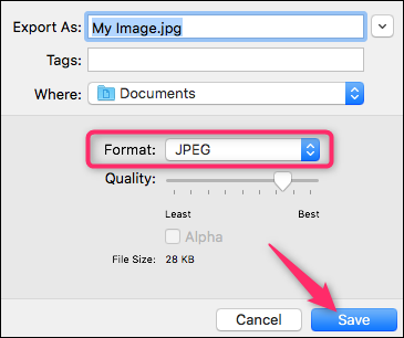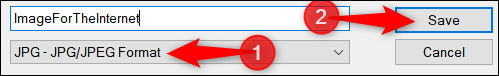 Açılan pencerede, format olarak JPEG’i seçin ve görüntüyü kaydetmek için kullanılan sıkıştırmayı değiştirmek için “Kalite” kaydırıcısını kullanın. Daha yüksek sıkıştırma daha küçük bir dosya boyutu anlamına gelir, ancak bazı görüntü kalitesini de kaybedersiniz. Hazır olduğunuzda, “Kaydet” düğmesine tıklayın.